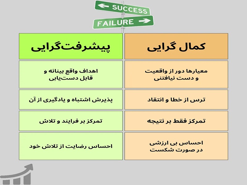 پیشرفتگرا اشتباهات و شکستهای احتمالی را میپذیرد و از آنها درس میگیرد. در مقابل، کمالگرا شکست را غیرقابل قبول میداند.